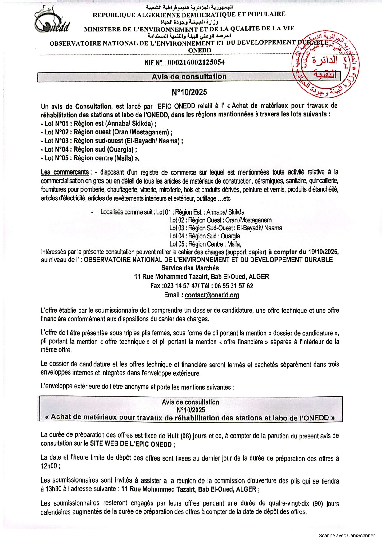 vis de consultation N°10/2025 portant « Achat de matériaux pour travaux de réhabilitation des stations et labo de l’ONEDD, dans les régions mentionnées à travers les lots suivants :